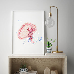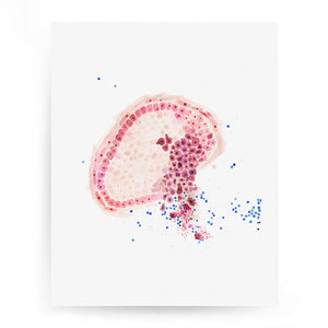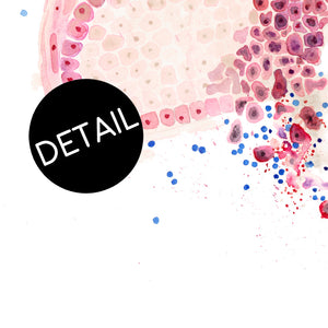 A reproduction print of my original watercolor painting depicting invasive ductal carcinoma, the most common type of breast cancer. Healthy duct cells are shown progressing into cancerous cells as you move around the painting. The cancerous cells spill out as they become invasive, but encounter chemotherapeutic drugs which attack the cells inducing apoptosis.