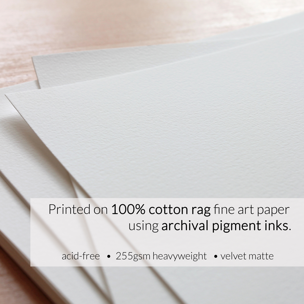 Fine art giclee prints are created using museum quality, archival materials. With a professional Canon imagePROGRAF photography printer, vibrant pigment inks are deposited onto lush Somerset Velvet, 100% cotton rag paper. The lightly textured heavy weight paper gives the look and feel of an original watercolor painting, and with the archival longevity of up to 200 years!